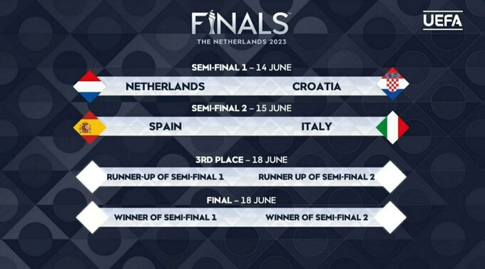 В жеребьевке участвовали 4 сборных, которые пробились в полуфиналы. По ее результатам 14 июня сыграют команды Нидерландов и Хорватии, а на следующий день встретятся сборные Испании и Италии.