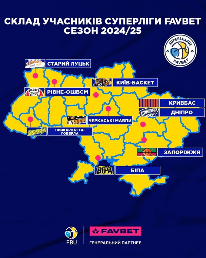 Весь состав Суперлиги-2024/2025: "Днепр" (Днепр), "Ровно" (Ровно), "Киев-Баскет" (Киев), "Черкасские Мавпы" (Черкассы), "Запорожье" (Запорожье), "Прикарпатье-Говерла" (Ивано-Франковск), "Старый Луцк" (Луцк), БИПА (Одесса), "Кривбасс" (Кривой Рог).