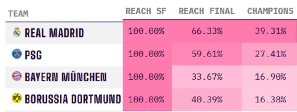 Главным фаворитом на выход в финал и победу в Лиге чемпионов компьютер считает "Реал". Вероятность победы команды украинского вратаря Андрея Лунина составляет 39,31%. Вторым идет ПСЖ с вероятностью чемпионства 27,41%.