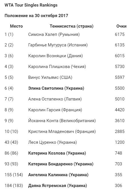 Лидером рейтинга останется румынка Симона Халеп, а в топ-3 вошли испанка Гарбинье Мугуруса и датчанка Каролин Возняцки, которая выиграла Итоговый турнир.