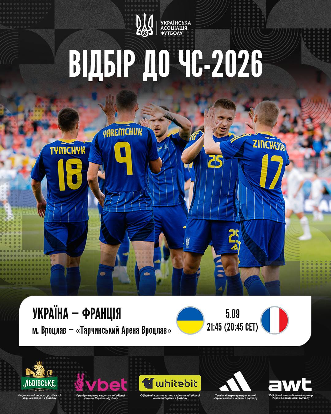 В пятницу, 5 сентября, в рамках матча 1-го тура квалификации на ЧМ-2026 сборная Украины по футболу в польском Вроцлаве сыграли против национальной команды Франции.