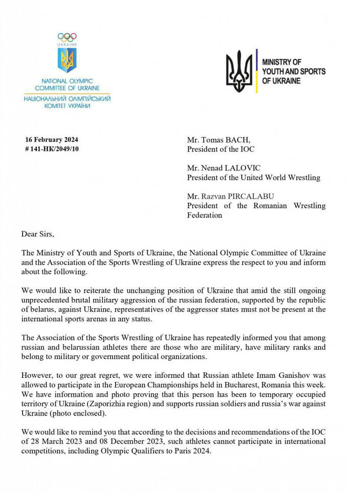 Минспорта, НОК Украины и Ассоциация спортивной борьбы Украины отправили письмо президенту Международного олимпийского комитета (МОК) Томасу Баху об этом факте.