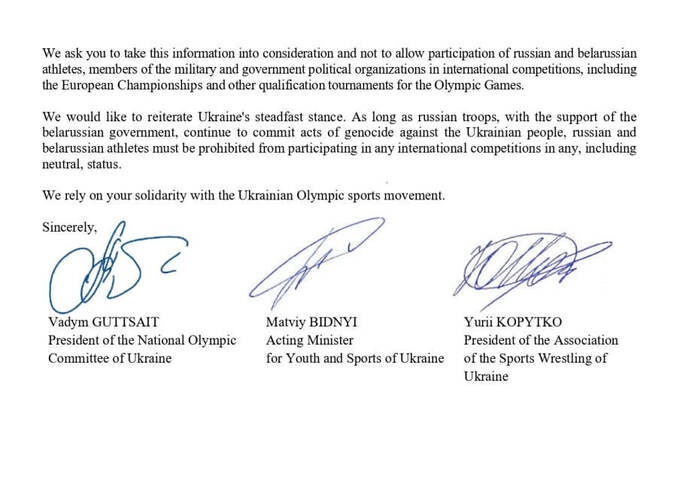 Хотим еще раз подчеркнуть твердую позицию Украины. Пока российские войска при поддержке правительства Беларуси будут продолжать совершать акты геноцида против украинского народа, российским и белорусским спортсменам должно быть запрещено участвовать в любых международных соревнованиях, в любом статусе, в том числе в нейтральном", – сказано в письме.