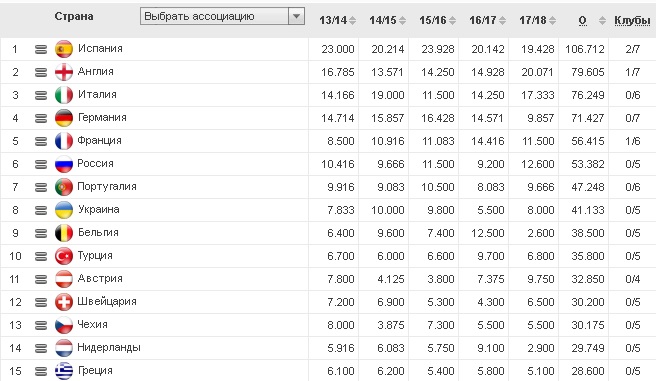 Финал Лиги чемпионов в Киеве подвел черту под клубным футбольным сезоном в Европе, сформировав окончательный рейтинг ассоциаций УЕФА за последние пять лет. Испания, несмотря на триумфы мадридских команд в ЛЧ и ЛЕ, имеет худший показатель за пять лет. В то же время Англия, заняв первое место в этом сезоне, добыла свой лучший рейтинг за всю историю. Напомним, Украина по итогам пятилетнего цикла расположилась на восьмой позиции.