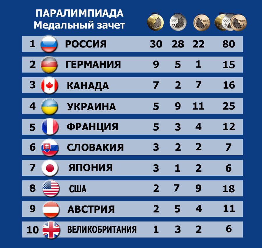 Впрочем, из-за того, что золотых медалей в активе украинцев всего пять, сборная Украины заняля четвертое место в общем медальном зачете, пропустив вперед Канаду, Германию и Россию. По общему числу наград мы уступили лишь россиянам - 25 против 80.