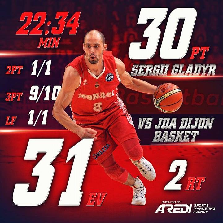В субботнем матче "Монако" Сергей Гладырь провел на паркете 22,3 минуты и отправил в корзину "Дижона" 9 трехочковых из 10 попыток.
