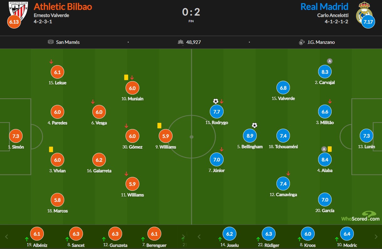 Мадридцы гостили у "Атлетика" Бильбао и одержали победу со счетом 2:0 благодаря голам Родриго и Беллингема в первом тайме.