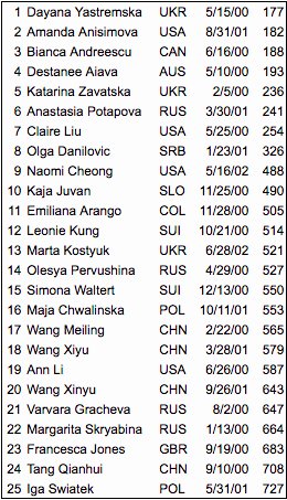 В топ-20 юниорского списка есть еще две украинки - Катарина Завацкая (5) и Марта Костюк (13).