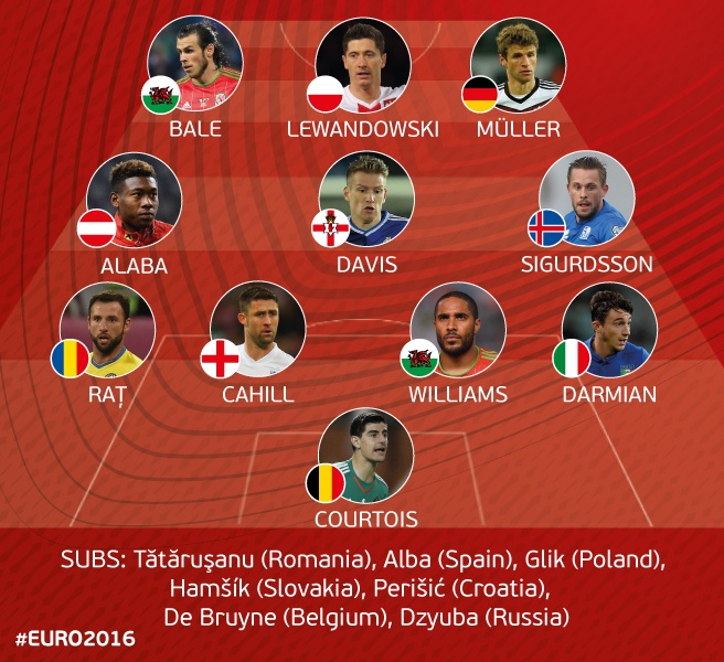 Основной состав: Куртуа (Бельгия), Рац (Румыния), Кэхилл (Англия), Уильямс (Уэльс), Дармиан (Италия), Алаба (Австрия), Дэвис (Северная Ирландия), Сигурдссон (Исландия), Бейл (Уэльс), Левандовски (Польша), Мюллер (Германия).