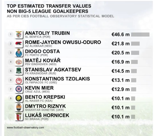 Рейтинг был составлен Международным центром спортивных исследований (CIES Football Observatory), который оценил Трубина в 46,6 млн евро.