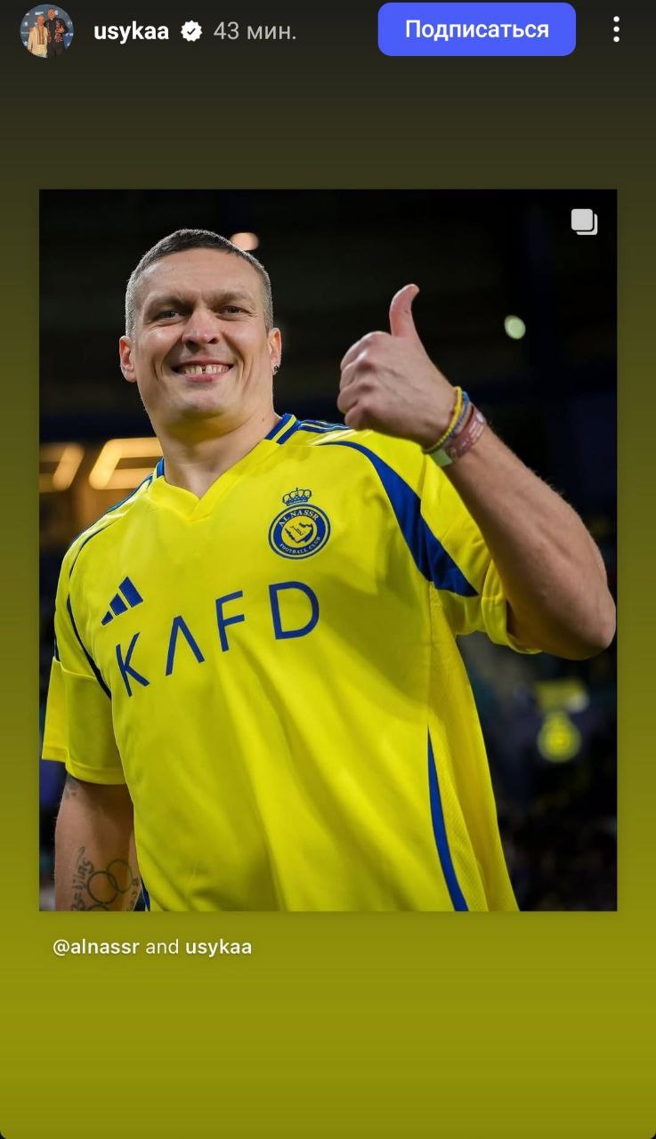 Украинский боксер в Instagram опубликовал фото с арены, а в перерыве поединка "Аль-Насра" против "Аль-Иттифака" Усик даже вышел на футбольный газон поприветствовать болельщиков.