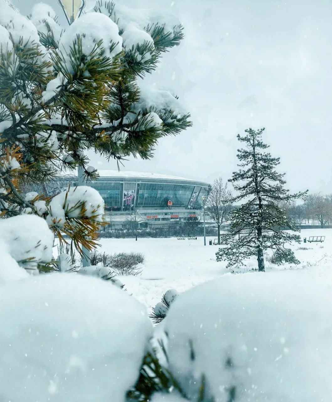 На снимках в местных донецких тг-каналах показана арена с некоторыми внешними повреждениями, а также заснеженный парк возле стадиона.