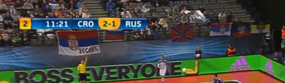 Во время матча чемпионата Европы по футзалу, который проходит в Сербии, болельщики вывесили на трибуне флаги "ДНР" и "Новороссии". Произошло это по ходу игры третьего тура группового этапа, в которой встречались Россия и Хорватия.