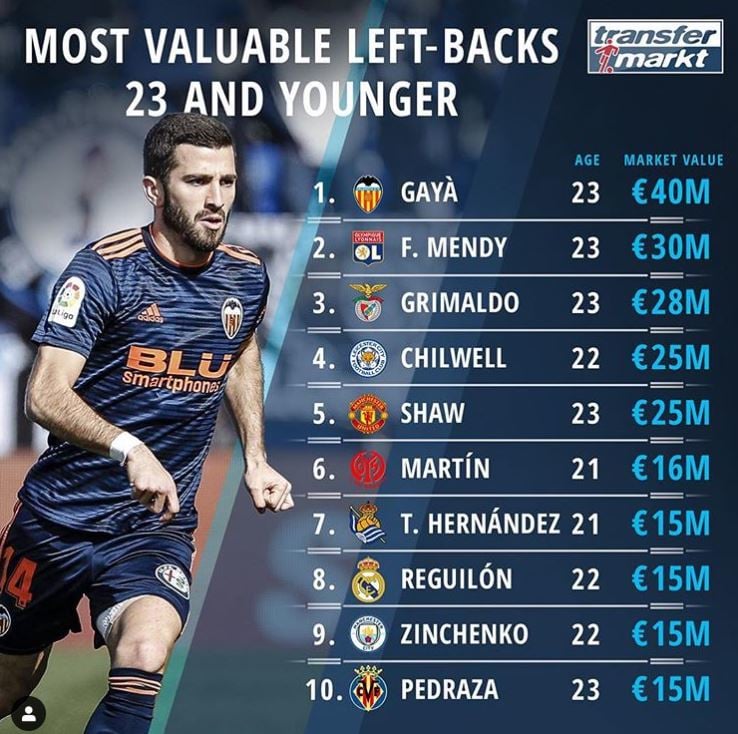 Самый дорогой левый защитник мира по версии Transfermarkt – Хосе Гайя из "Валенсии", его стоимость 40 млн евро.