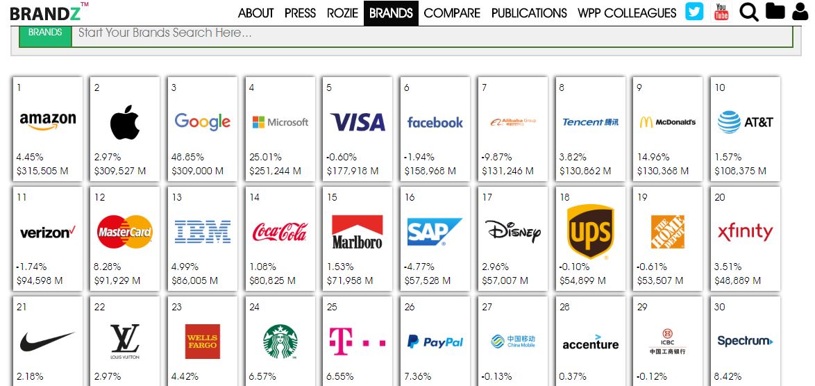 Facebook сохранил шестое место, в то время как Alibaba впервые обогнал Tencent и стал самым ценным китайским брендом, поднявшись на две позиции до 7 места. Его стоимость за год увеличилась на 16% и достигла $ 131,2 млрд. Tencent опустился на три позиции и попал на восьмое место, потеряв 27% стоимости в годовом исчислении ($ 130,9 млрд).