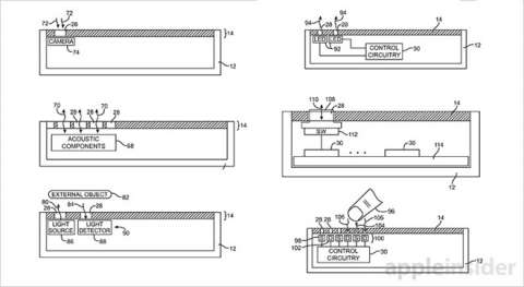 Согласно поданному патенту, Apple планирует поместить часть датчиков и сенсоров в миниатюрных отверстиях между пикселями. Фронтальная же камера и кнопка "Домой" будут размещаться в вырезах непосредственно в самом дисплее.