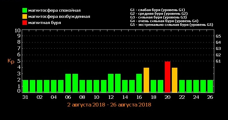 Астрономы заявили о том, что 20 августа Землю накроет слабая магнитная буря класса G1 по пятибалльной шкале. Магнитосфера планеты будет возбужденной также 17 и 21 августа, свидетельствуют данные лаборатории рентгеновской астрономии Солнца ФИАН.