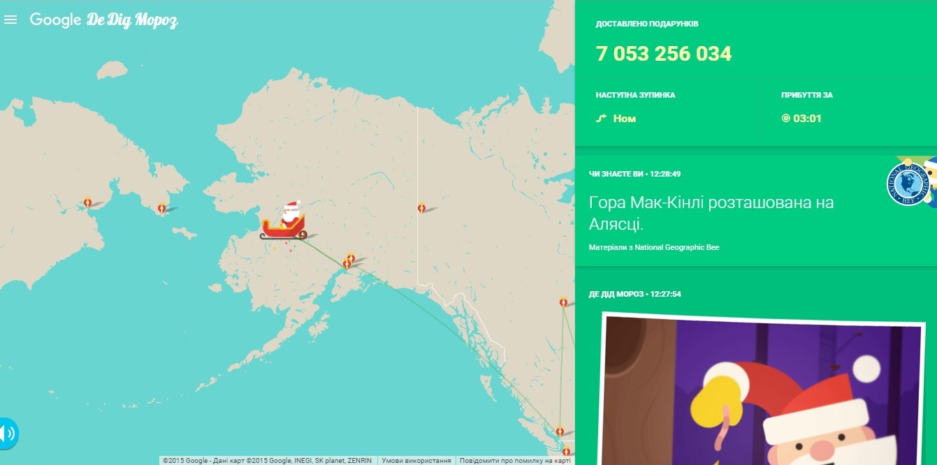 Сайт Google в украинской версии получил название "Де Дід Мороз". Он представляет собой интерактивную карту, на которой отображается не только актуальное местоположение Деда Мороза, но и его отдаленность от места пребывания пользователя. На сайте также можно поиграть в рождественские игры. При нажатии на отметку на карте появляется статья из Википедии, которая рассказывает о выбранном месте.