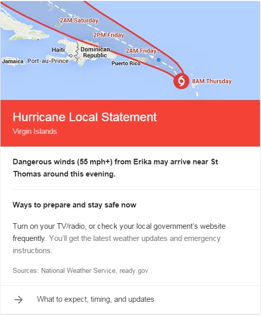 Отныне пользователи, которые ищут информацию об ураганах или штормах, будут получать сведения, которые помогут им избежать столкновения со стихией. В зависимости от местоположения пользователей Google будет выдавать информацию, которая может быть потенциально полезной. Информация будет включать в себя карту, которая показывает движение грозы относительно места, в котором находится пользователь, подробные прогнозы и визуализацию движения торнадо. Кроме того, Google будет также давать советы относительно того, как вести себя в чрезвычайной ситуации. Если ураган далеко, поисковик выдаст информацию о том, как подготовить аварийный комплект, а если буря уже близко, пользователи найдут советы о том, как защитить себя и своих близких.