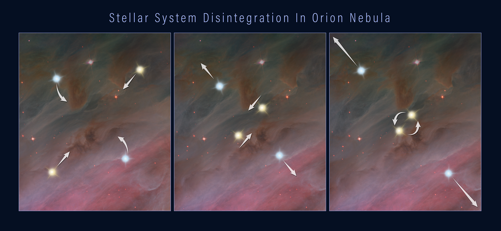 Теперь же с помощью "Хаббла" ученые обнаружили третью "беглянку". Оказалось, что все три звезды входили в одну систему, которая располагалась недалеко от центра туманности Ориона, на расстоянии 1300 световых лет от Земли.