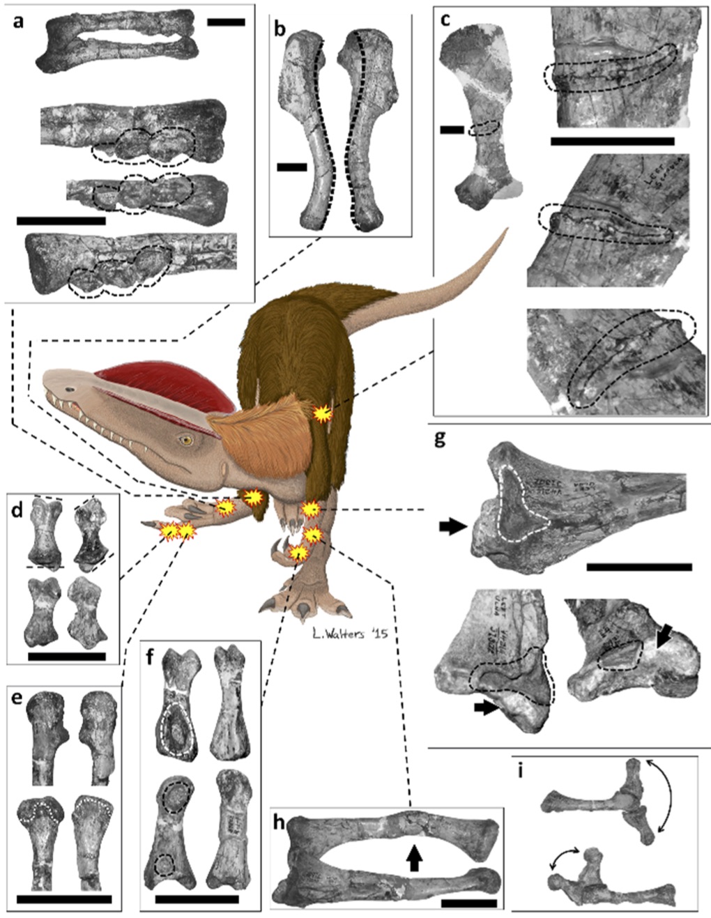 Ученый обнаружил заживший перелом на левой лопатке и на левой лучевой кости дилофозавра. Левая локтевая кость имела следы остеомиелита – гнойно-некротического процесса. Динозавры, в отличие от млекопитающих, не имели возможности восстановления костной ткани. Очевидно, остеомиелит также поразил пальцы передних конечностей существа. Кроме того, правая лучевая кость динозавра имела следы трех опухолей и торчала из бока животного.