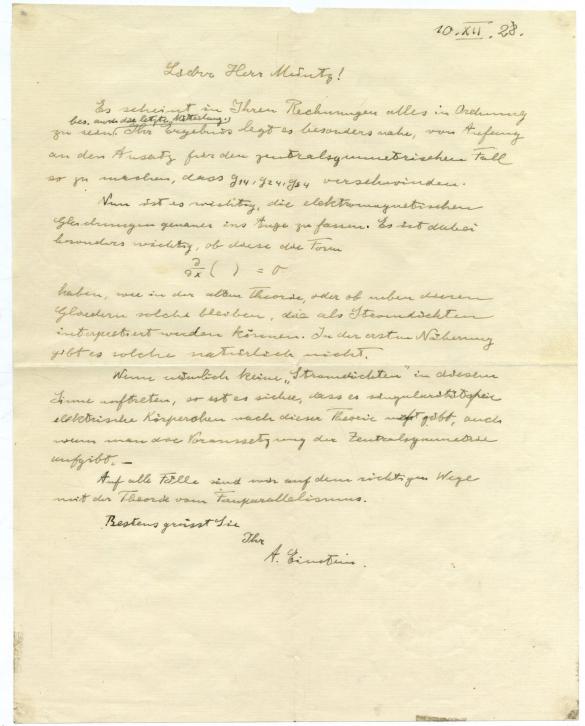 Письмо было написано 10 декабря 1928 года и отправлено из Берлина, оно адресовано математику Герману Мюнцу. В письме Эйнштейн описал финальные этапы развития теории относительности. Также к письму был приложен конверт, в котором оно было отправлено.