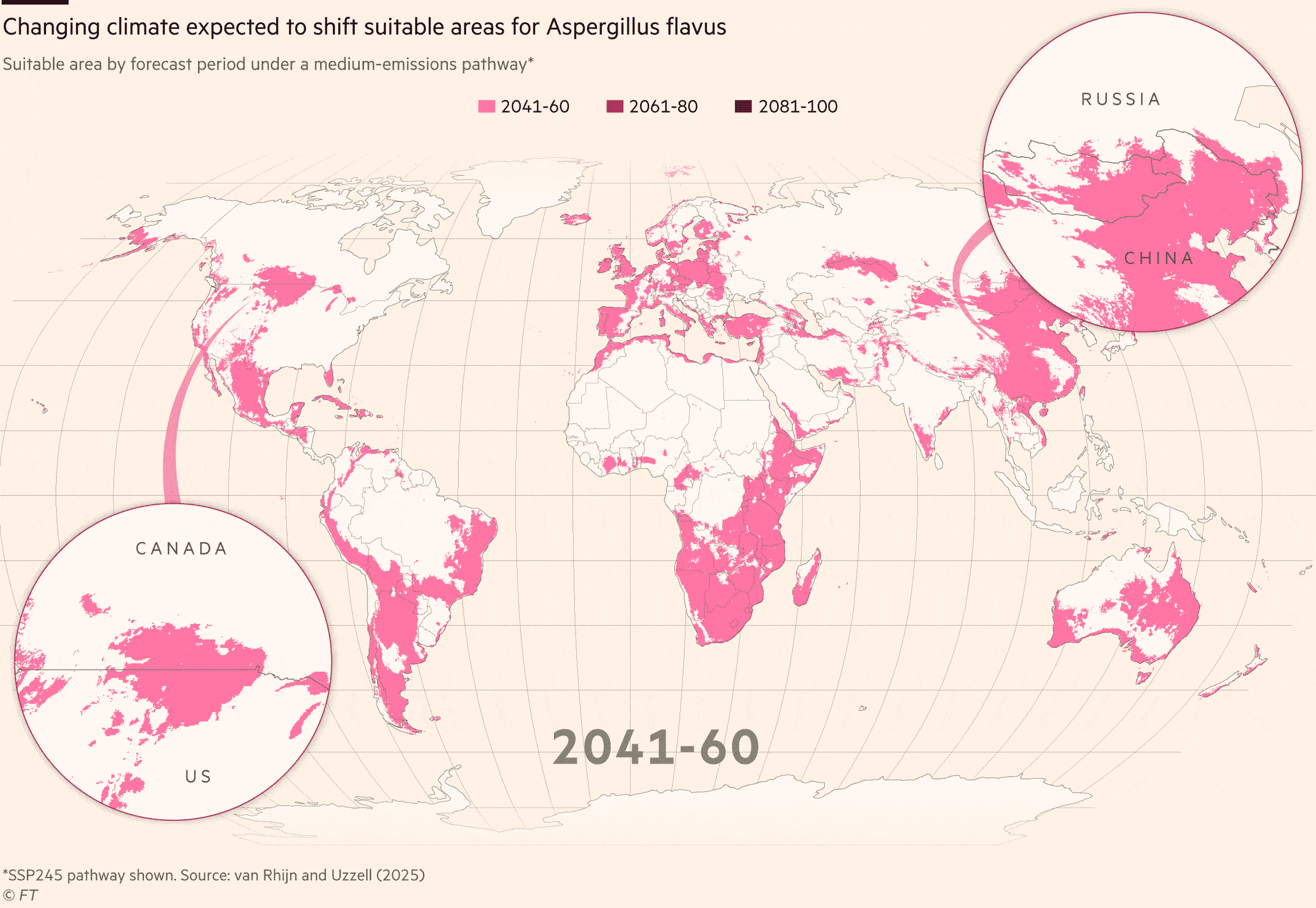 Другой вид Aspergillus flavus поражает сельскохозяйственные культуры и, согласно прогнозам, может распространиться еще на 16% территории. Он может закрепиться в северном Китае, Скандинавии, Аляске и России, теряя пригодные для жизни места в Африке и Бразилии. Это повлияет на местные экосистемы, где грибок играет немаловажную роль в разложении веществ.
