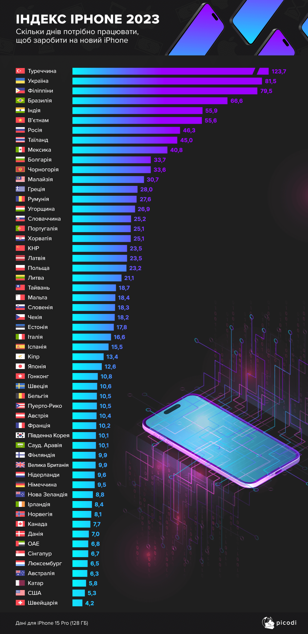 Меньше всего дней нужно работать, чтобы заработать на новый айфон, в Швейцарии - всего 4,2, и в США - 5,3. Больше всего трудовых дней для покупки уйдет у граждан Турции - 123,7.