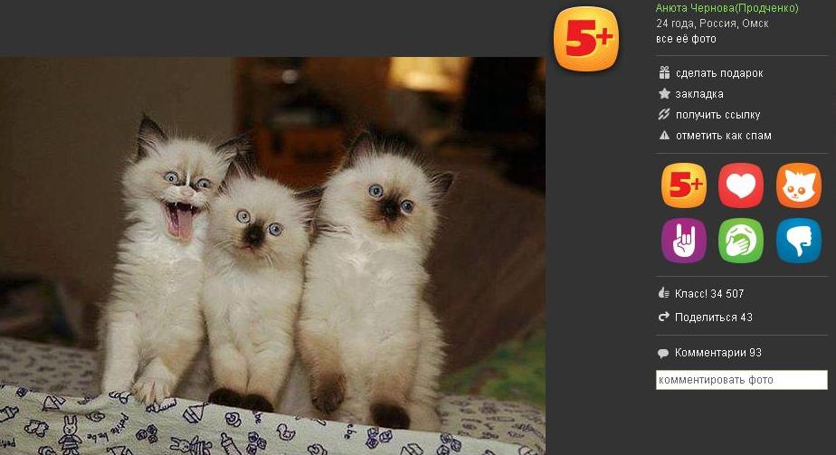В социальной сети "Одноклассники" появились новые оценки фотографий. Рядом со стандартными кнопками "Класс" и "Поделиться" появились новые картинки с сердечком, котиком, "козой", зевающим смайлом и пальцем, направленным вниз (долгожданный unlike). После нажатия на одну из кнопок, в верхнем углу картинки появляется пользовательская оценка фотографии. Кнопка "5+" работает, как и раньше на платной основе.