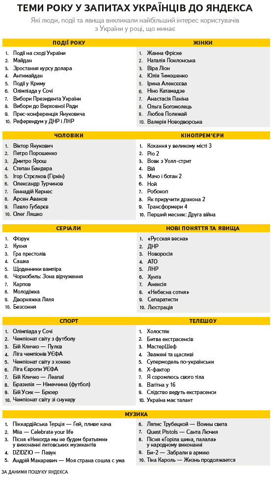 Украинских пользователей Яндекса в течение 2014 года больше всего интересовала обстановка на востоке страны. Далее по количеству запросов идут события на Майдане, а за ними - курс доллара.
