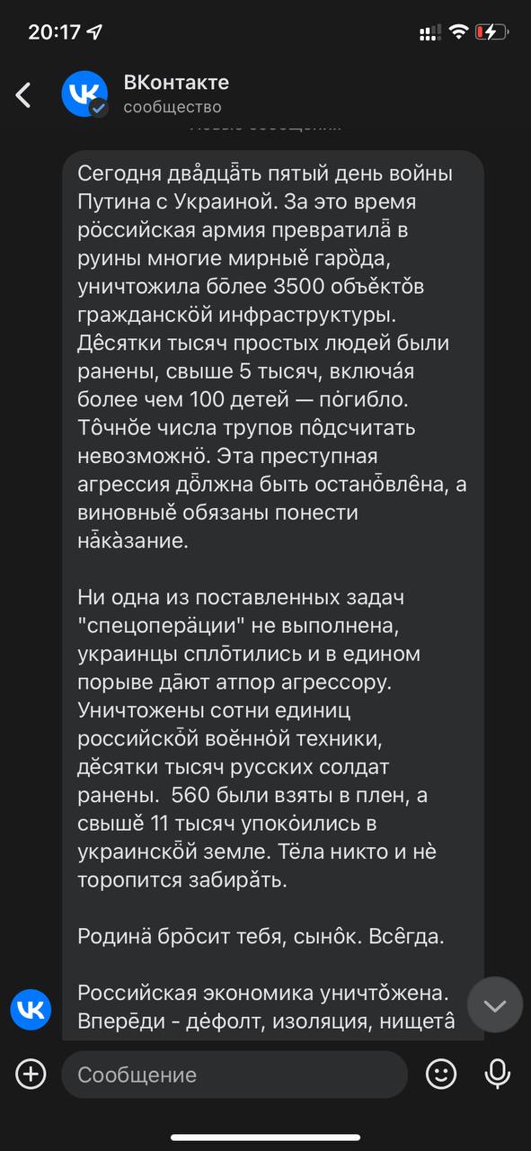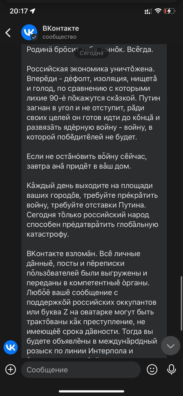 "Все личные данные, посты и переписка были выгружены и переданы в компетентные органы. Любое ваше сообщение с поддержкой российских оккупантов или буква Z на аватарке могут быть трактованы как преступление, не имеющее срока давности", - сказано в одном из сообщений, которые массово начали получать пользователи ВКонтакте.