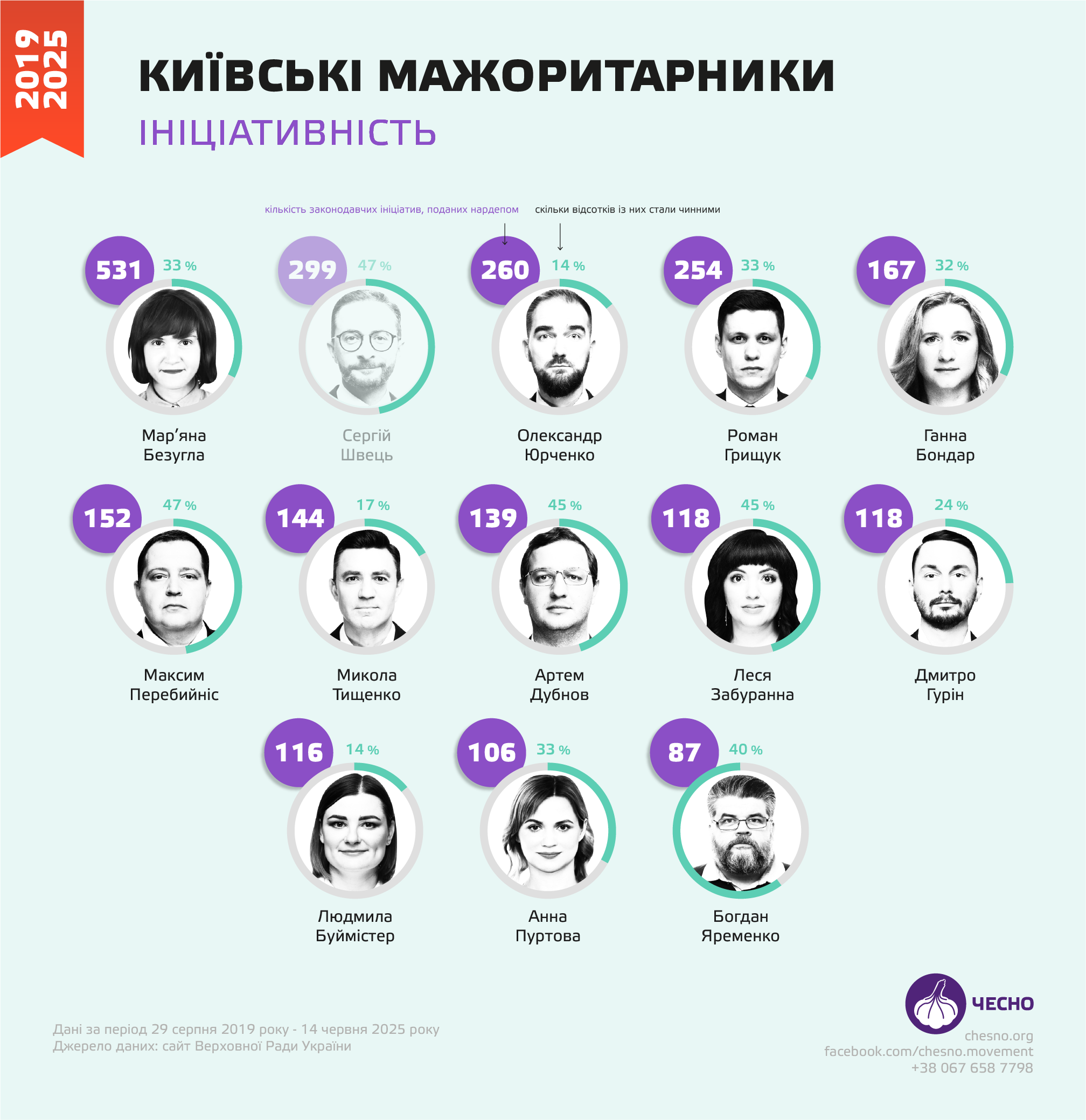 По уровню инициативности Анна Бондарь занимает пятое место среди столичных мажоритарщиков, но является лидером по количеству проектов по Киеву — 30 из 167 зарегистрированных.
