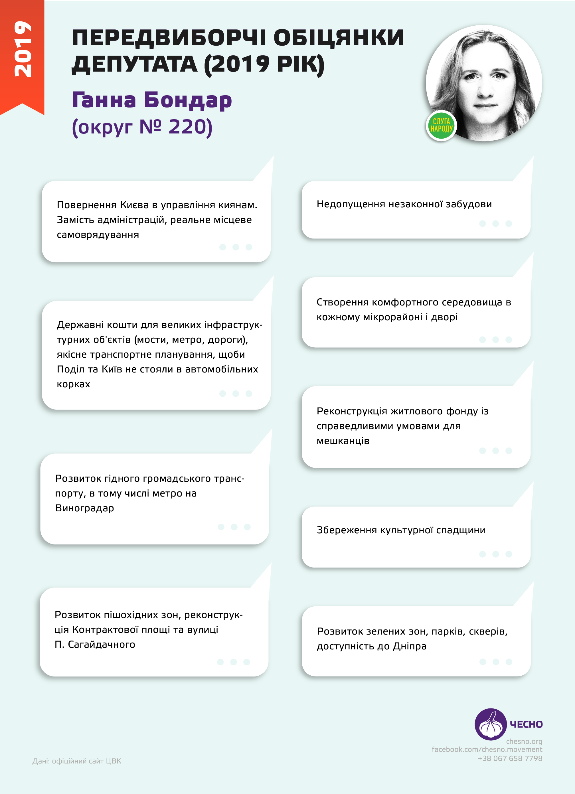 Интересы киевлян и, в частности, Подольского района в ВРУ представляет Анна Бондарь — заслуженный архитектор, до выборов занимавшаяся городскими и государственными проектами развития территорий. До прихода в парламент Бондарь имела опыт работы в КГГА. В 2012–2015 годах была начальником отдела ландшафтной архитектуры и художественного оформления Департамента градостроительства, а позднее — и.о. директора и заместителем директора Департамента.