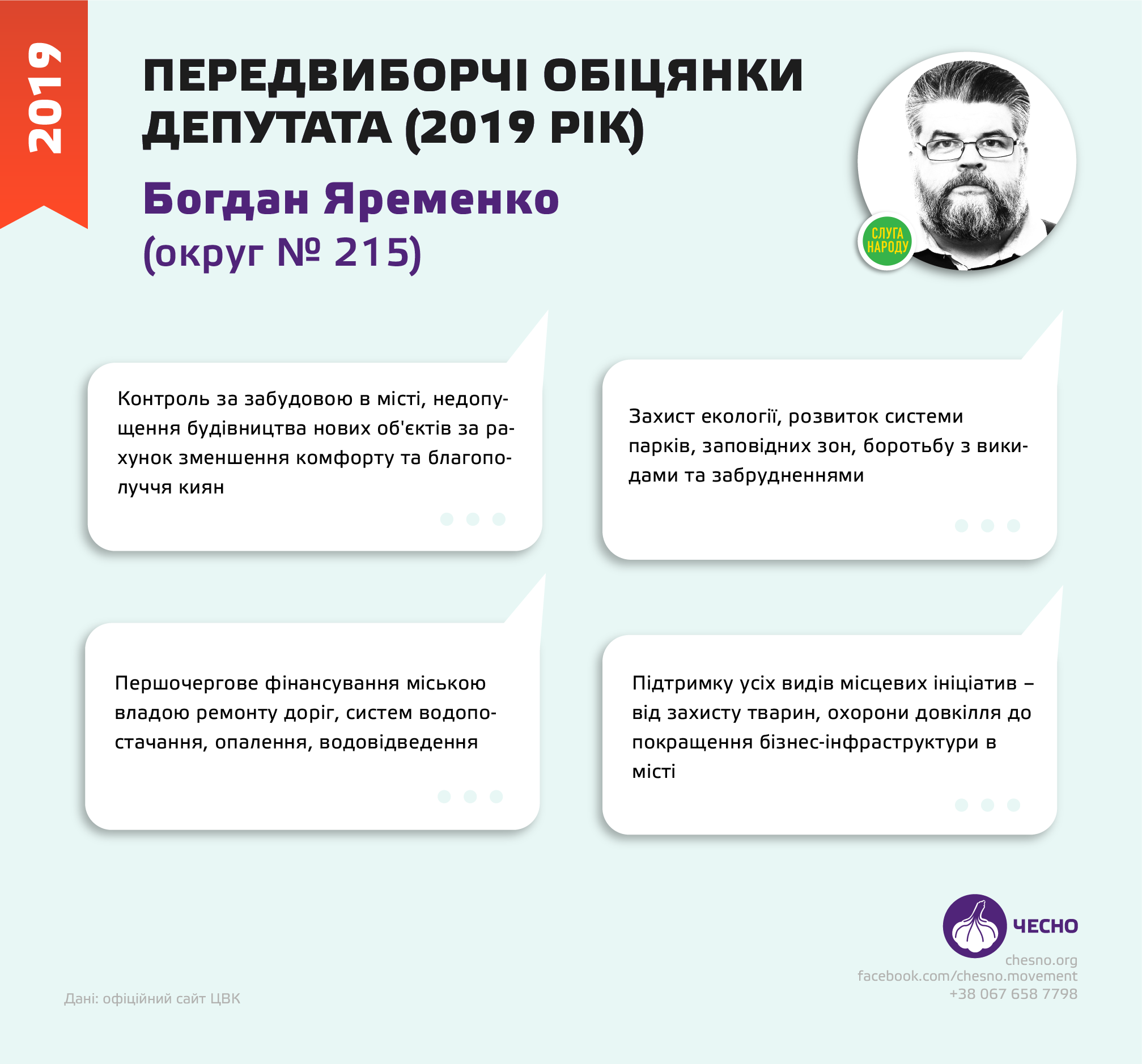 За время работы в Раде Яременко был соинициатором 87 законопроектов — этот показатель — самый низкий среди киевских мажоритарщиков. На тему столичных вопросов депутат подал всего четыре инициативы, и все периода 2019–2021 годов.