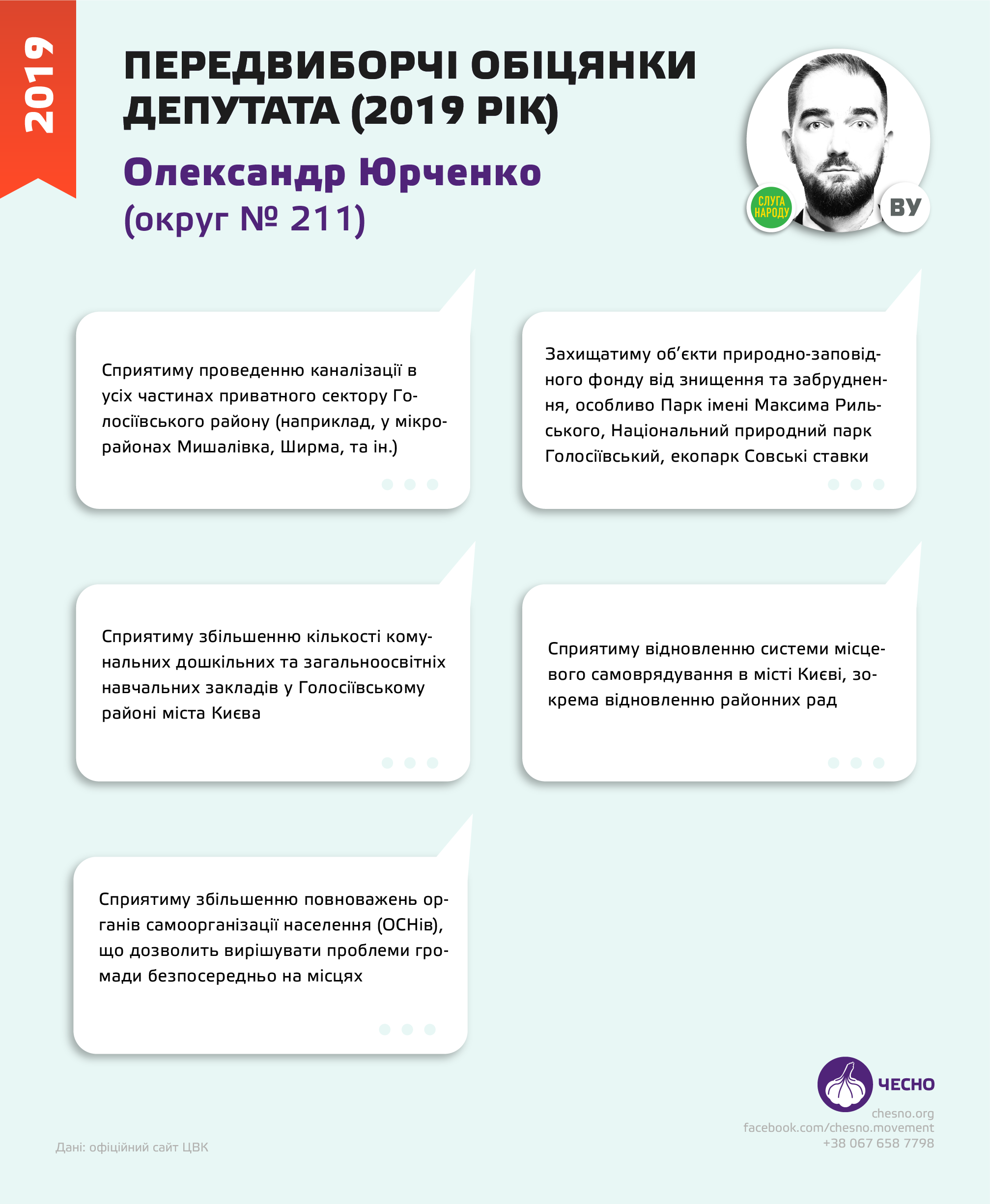 Александр Юрченко был избран по округу Голосеевского района. В свое время входил в Народный совет Голосеевского района, баллотировался в Киевраду от УКРОПа, был главой Общественного совета при Голосеевской РГА, а также помощником трех нардепов УКРОПа.