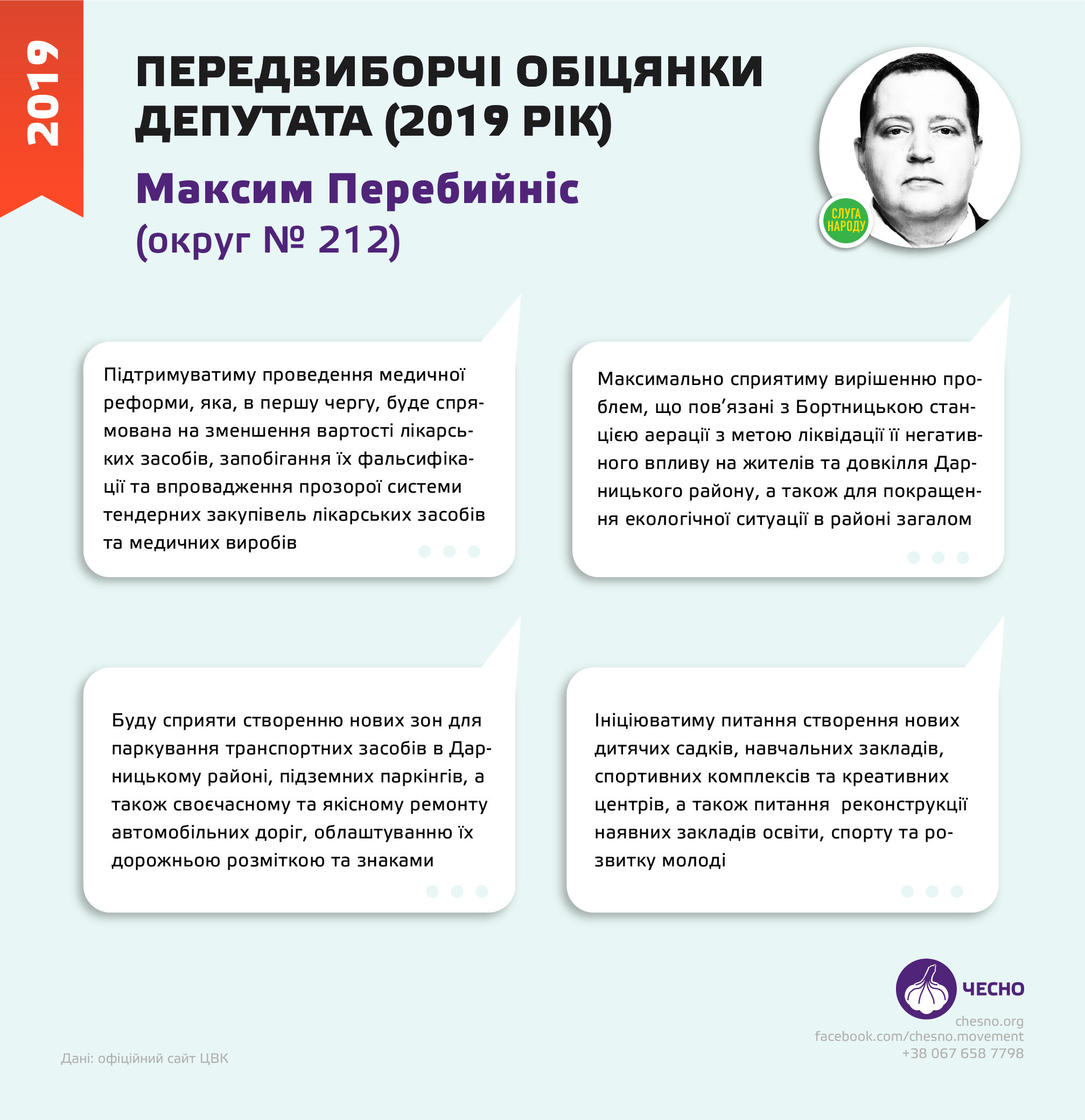 В парламентскую сферу Максим Перебийнис пришел из медицинской: до получения мандата был заведующим отделением анестезиологии в клинике «Борис» и преподавал в университете Богомольца. Профессиональный опыт повлиял и на дальнейшую роль депутата, ведь Перебийнис является главой подкомитета по вопросам здравоохранения.