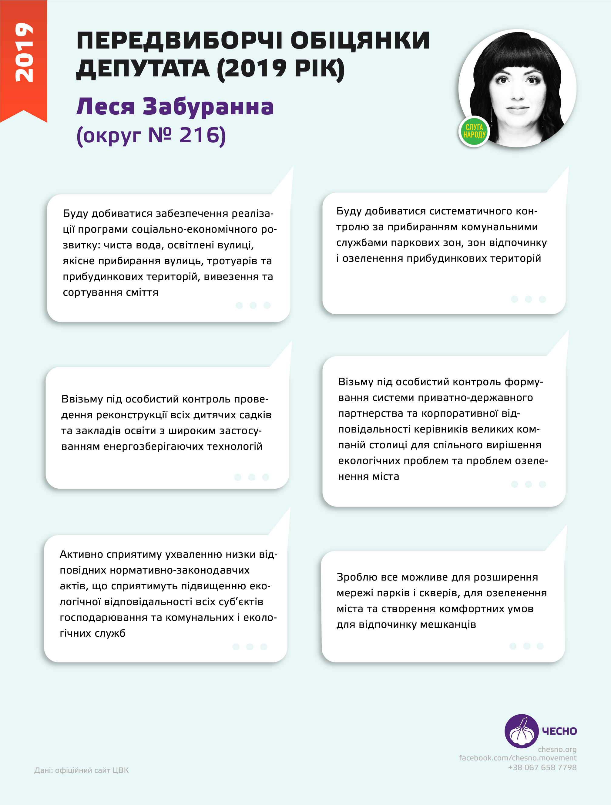 До избрания Леся Забуранная была профессором кафедры менеджмента Национального университета биоресурсов и природопользования. Также в 2014 году была соучредителем фонда «Лідери змін», который, по данным Youcontrol, имел связи с группой «Приват» Игоря Коломойского. Кстати, этот фонд несколько раз был замечен в гречкосействе.