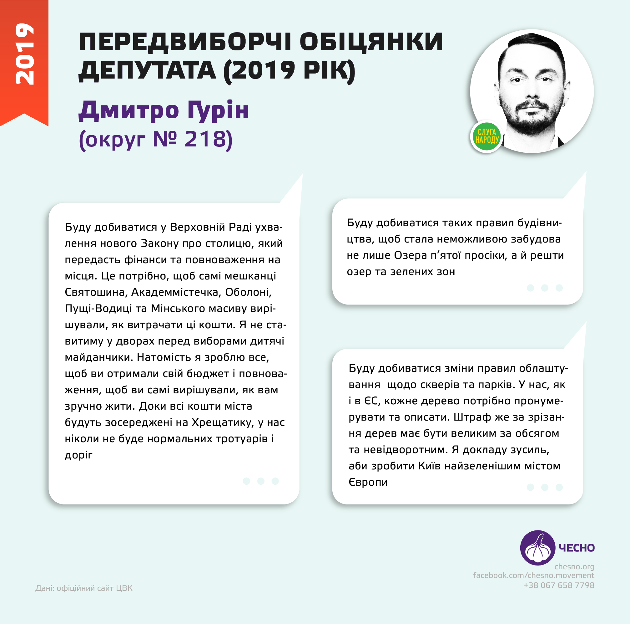 В конце концов кандидатом от «Слуг» на местных выборах в Киеве стала Ирина Верещук, а Дмитрий Гурин продолжил работу в парламенте. За пять с половиной лет депутат зарегистрировал 118 законопроектов, 16% из которых касались вопросов столицы. Это были, в частности, вопросы сохранения культурного наследия и изменений в градостроительную деятельность. Но, как и у других киевских избранников, большинство из них датируется 2019–2021 годами. На протяжении последних лет депутат больше сосредоточивался на проектах по социальной защите ветеранов и здравоохранения.