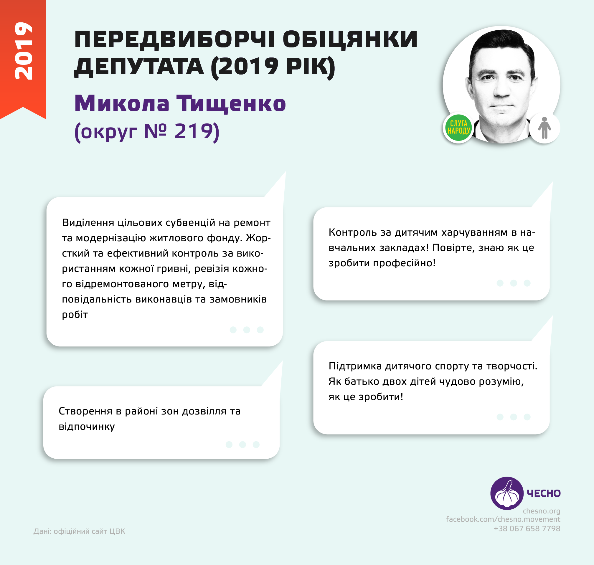 В прошлом ресторатор и телеведущий, а еще кум руководителя офиса президента Андрея Ермака Николай Тищенко представляет в ВРУ Святошинский район. За время своей работы в Раде он попал не в одну громкую историю. Вспомним хотя бы работу его ресторана «Велюр», несмотря на карантинные ограничения, передачу некачественных бронежилетов бойцам Святошинского ТрО, щедрое наполнение песочниц на детплощадках Киева. А еще ссоры с коллегами, в частности конфликт с Марьяной Безуглой и драку в Раде с Гео Леросом.