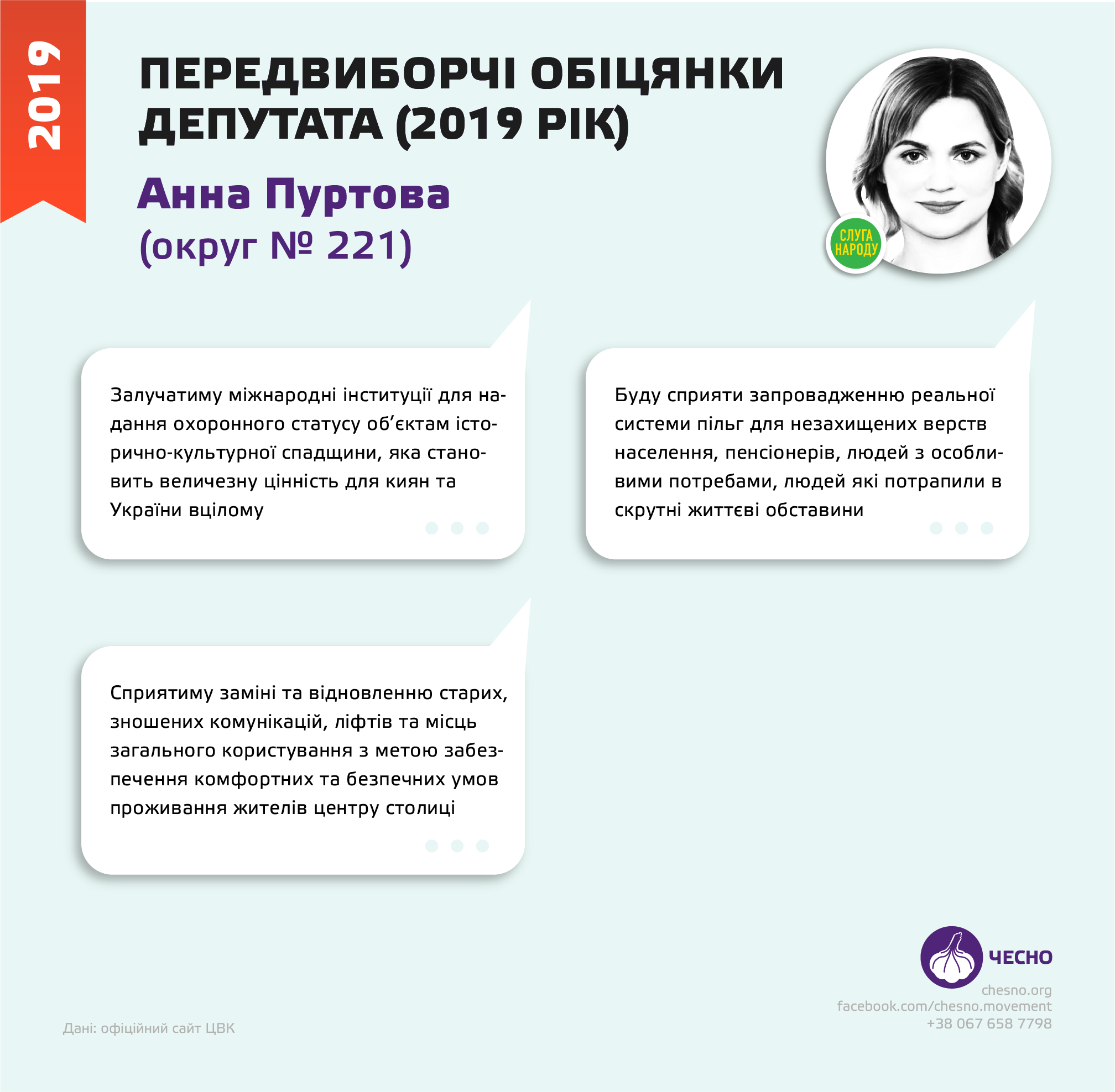 Анна Пуртова представляет в Раде 221-й округ, объединяющий Печерский и часть Соломенского и Шевченковского районов. До избрания работала в бизнесе. Создала несколько благотворительных проектов, в частности ОО «У порядку», в список соучредителей которой входит бизнесмен и владелец киевского ТРЦ «Дрим Таун» Григорий Корогодский.
