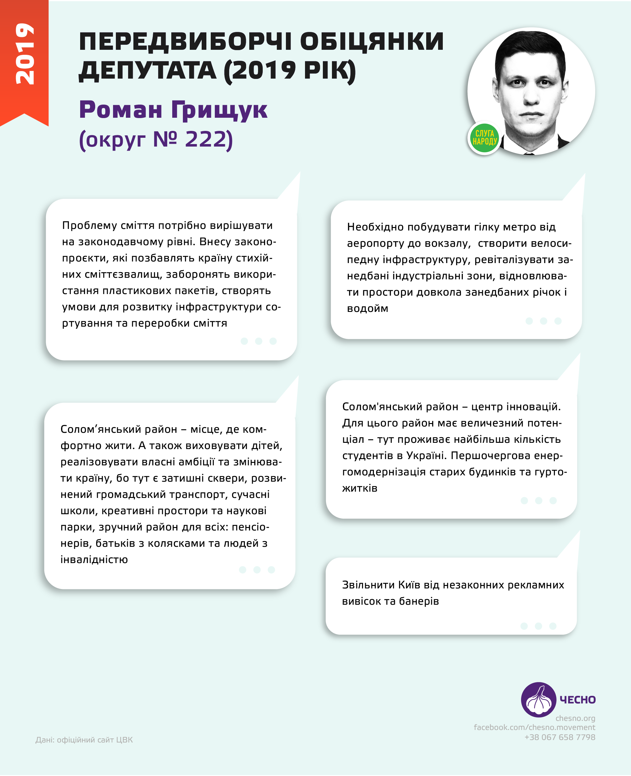 Роман Грищук получил мандат в 222-м округе Соломенского района, обойдя по голосам многолетнего депутата этого округа Дмитрия Андриевского. Входит в политсовет «Слуги народа».