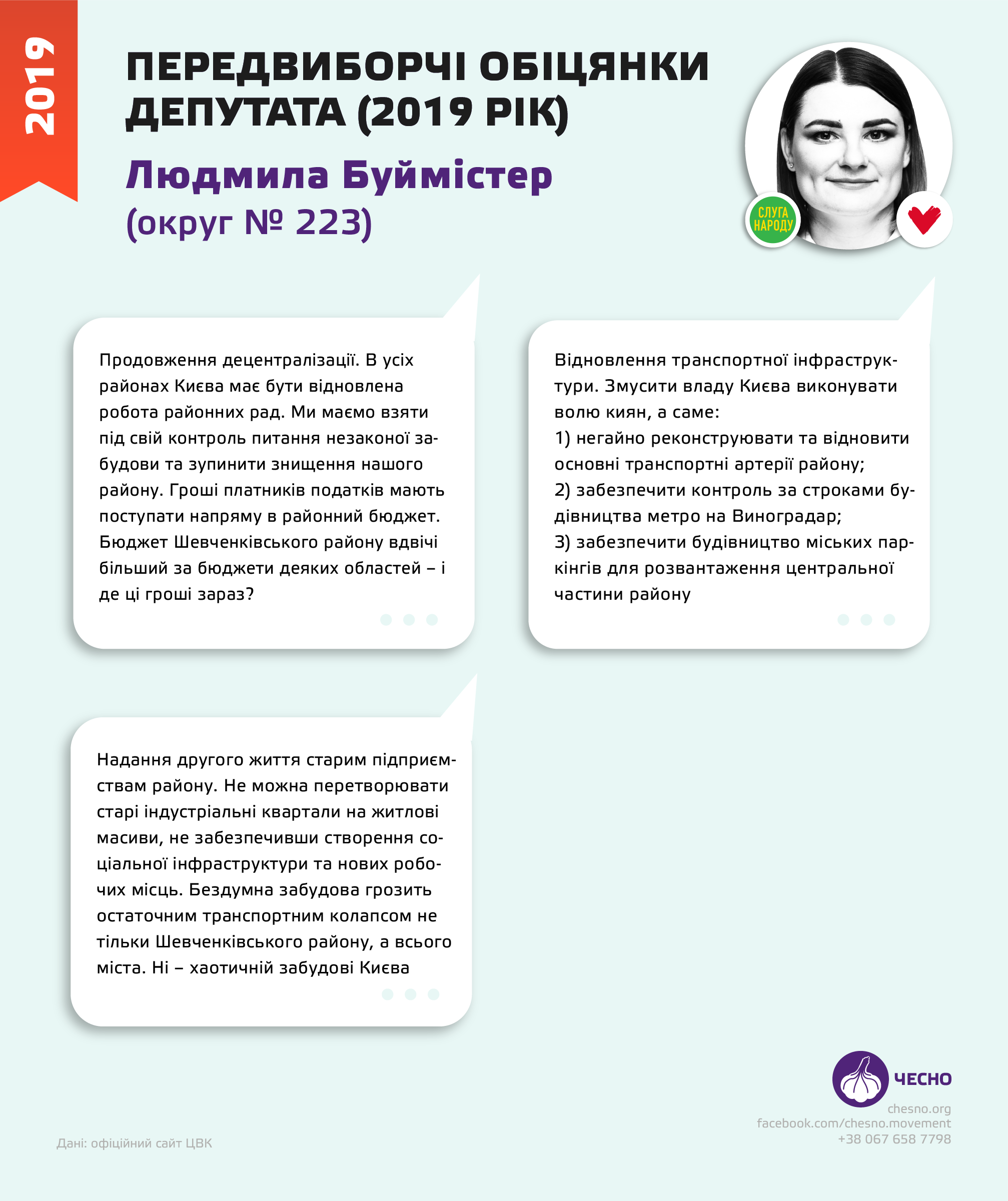Людмила Буймистер, баллотировавшаяся от Шевченковского района, до депутатства многие годы проработала на менеджерских должностях в разных компаниях из орбиты бизнесмена и политика Сергея Таруты. Также является сооснователем нескольких благотворительных организаций, связанных с олигархом, в частности БФ «Врятуємо наш Київ».