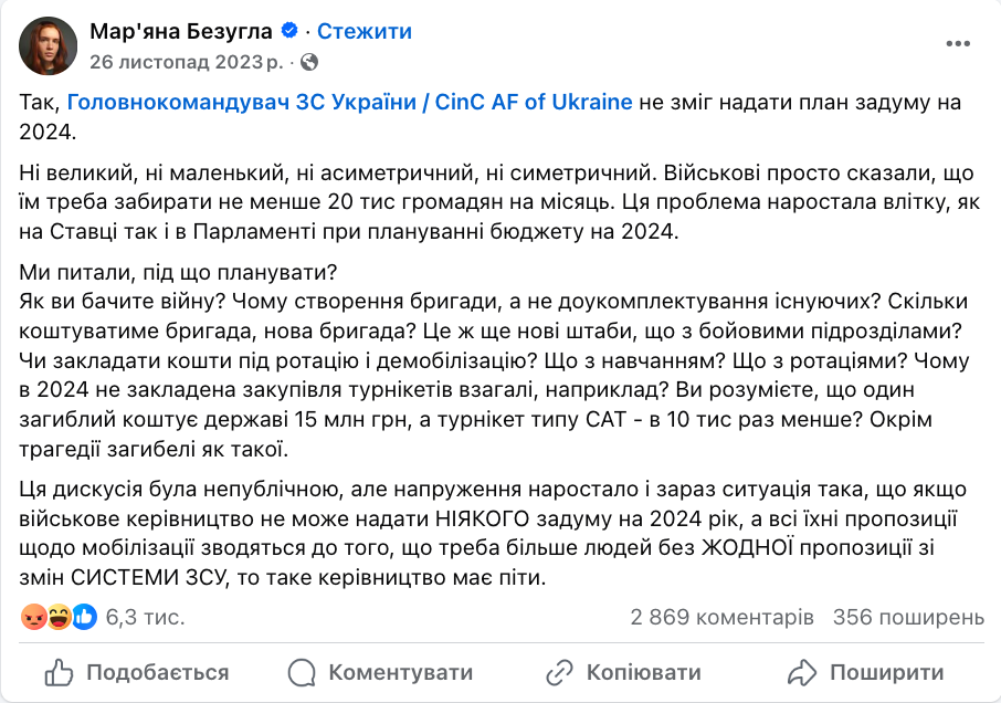 Тогда коллеги депутата инициировали ее отзыв с двух должностей в комитете по вопросам национальной безопасности, обороны и разведки. Сама Безуглая сообщала в начале 2024 года, что написала заявление на выход из фракции и партии, но через несколько месяцев свое мнение изменила, «чтобы не подводить Президента в тяжелые времена». Но после того как Марьяну Безуглую сняли с должности главы подкомитета по вопросам демократического гражданского надзора и контроля, произошел окончательный выход из фракции.