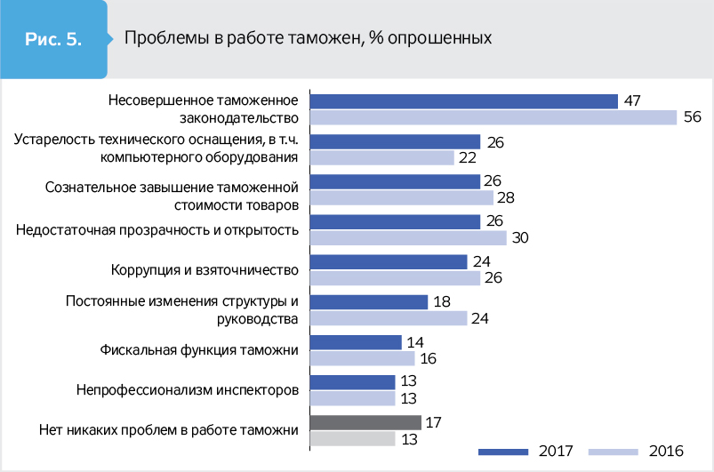 "Отвечая на вопрос, что создает основные проблемы для предприятий, почти половина опрошенных (47%) отметила несовершенное, с их точки зрения, таможенное законодательство. Предприятия подразумевают широкий круг проблем, которые включают в себя также практику применения регуляторных норм, - отмечают эксперты. - Далее идут три проблемы, каждую из которых выбрало чуть больше четверти респондентов (26%). Это устарелость технического оснащения, сознательное завышение таможенной стоимости товара и недостаточная прозрачность и открытость в работе таможни. Важность проблемы устарелости технического оснащения несколько возросла по сравнению с 2016 г., зато доли предприятий, говорят о сознательном завышении таможенной стоимости товаров и недостаточную прозрачность и открытость на таможне, несколько уменьшились".