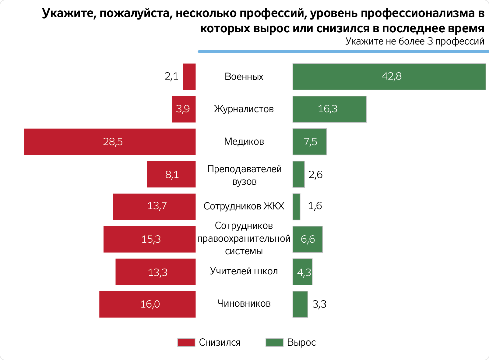 По словам авторов, не получила высокой оценки и недоделанная реформа МВД. Отрицательное сальдо учителей (-9%) опережает показатель вузовских преподавателей (-5,5%) скорее потому, что все опрашиваемые проходили через школу, но не все - через университеты. Более того, при оценке людей, несущих знания, респонденты скорее сравнивали нынешний уровень с тем, который был, а не с тем, который должен быть. У чиновников показатель -12,7 - комплиментарный. Ведь показатель падения уровня управленцев, администраторов госуслуг и профильных чиновников после всех чисток именем лояльности должен опережать показатель медиков.