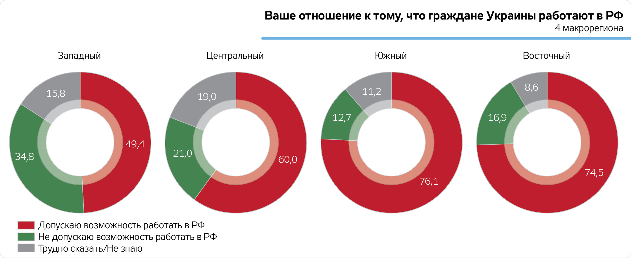 Из тех, кто определился с отношением к гастарбайтерству украинцев в России (а 14,8% затруднились ответить на данный вопрос), допускают возможность работать в РФ: 74% опрошенных в Центре и 58,6% опрошенных на Западе.