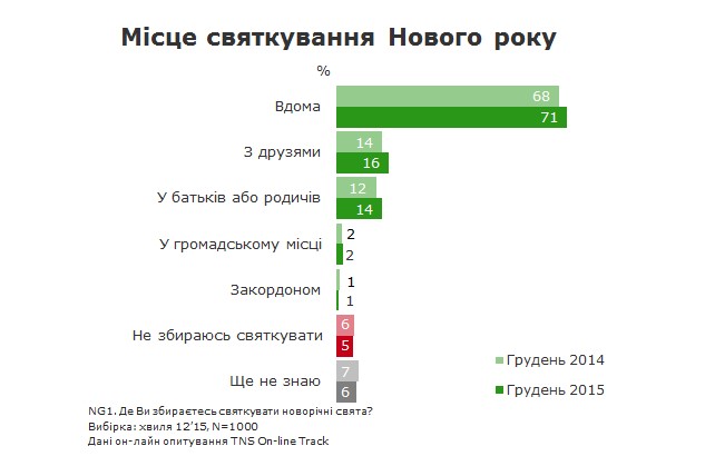 Вариант с "друзьями" выбрали 14% респондентов, "с родителями или родственниками" - 12%, в общественном месте – 2%. Только 1% украинцев будут встречать 2016 год будет за границей. При этом 6% вообще не собираются праздновать Новый год.
