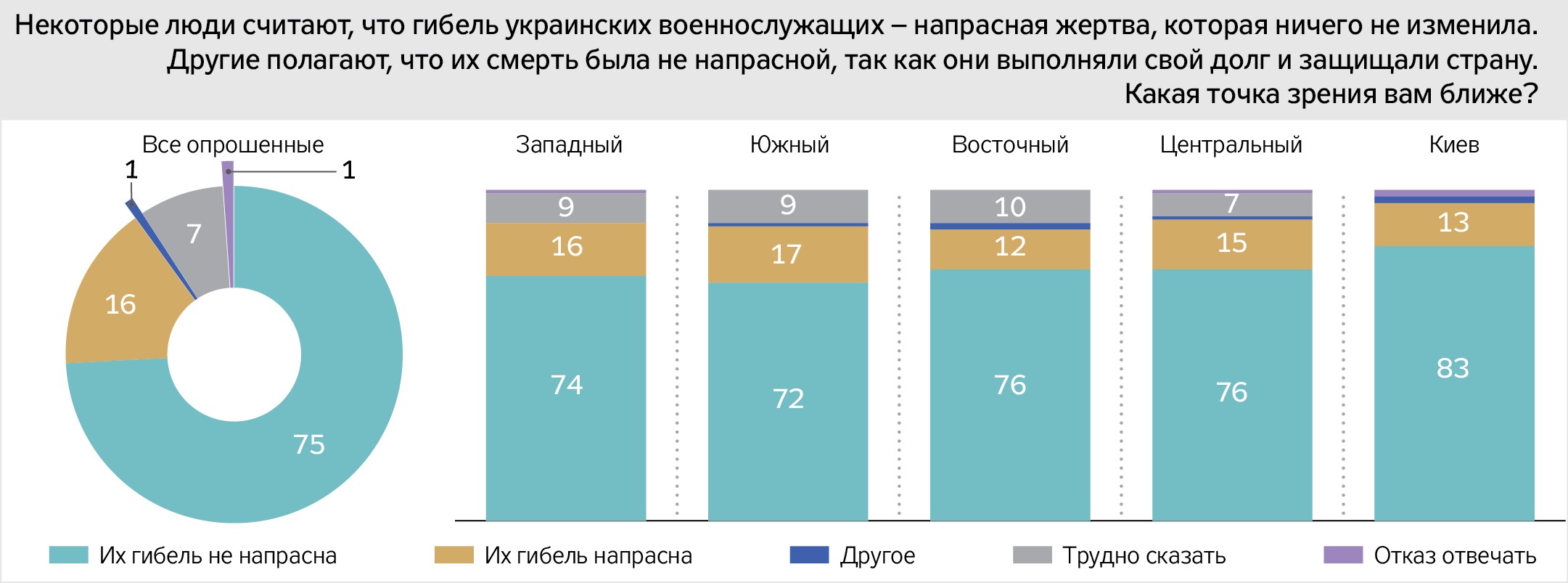 75% матерей, вдов, отцов, взрослых детей, сестер и братьев считают, что гибель родного человека была не напрасной. "Они выполняли свой долг и защищали страну". Семьи не просто тешат себя этим, а верят в то, что это так и есть. Именно поэтому они столь чувствительны к вопросам памяти и проявлениям уважения государством и обществом к павшим за нас.
