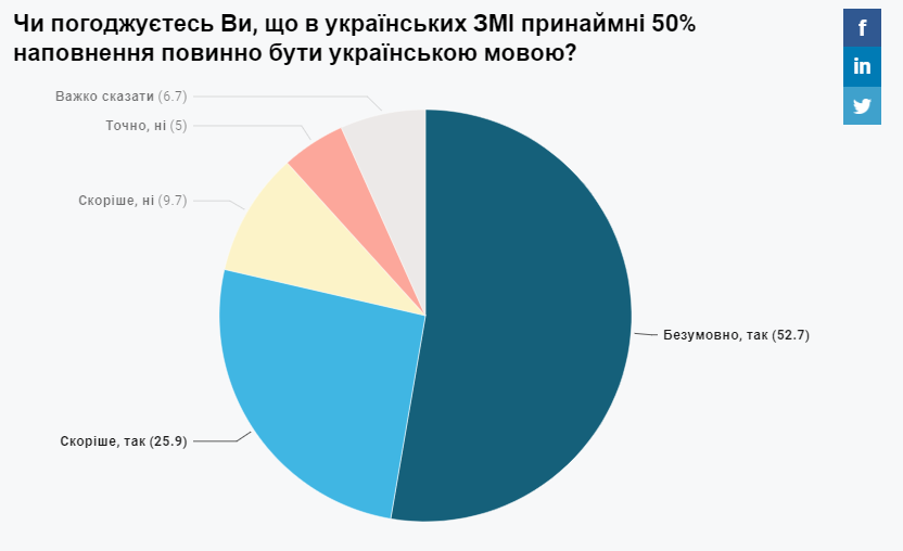 Также 79% опрошенных считают, что в украинских СМИ по крайней мере половина материалов должнf быть на государственном языке, из них 53% с таким утверждением "безусловно согласны", еще 26% ответили "скорее, да". Такого мнения в Западном регионе придерживаются – 96% респондентов, в Центральном – 82%, в Восточном – 66%, в Южном – 63%.