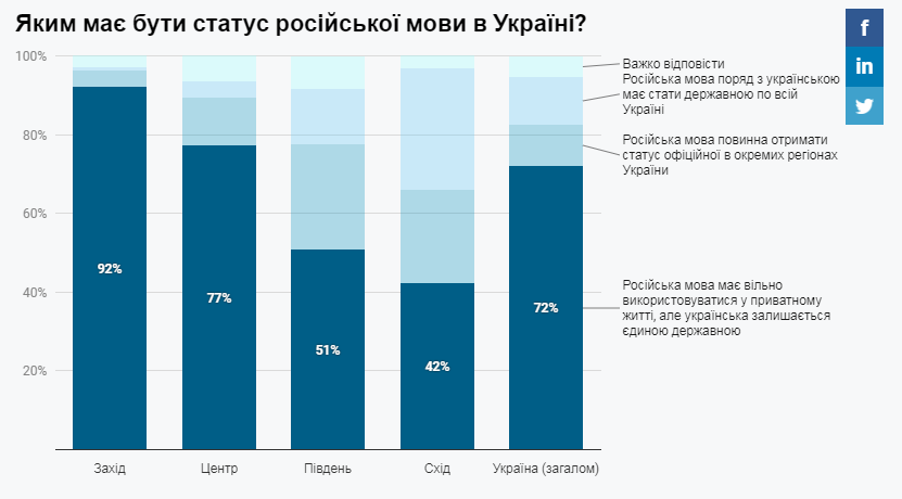 В Южном регионе статус русского языка как языка повседневного общения, а признание украинского как единственного государственного, поддерживает 51%, как официального в определенных регионах – 27% и как второго государственного – 14%. Наиболее значимый статус русского языка поддерживают в Восточном регионе, где тоже преобладает поддержка русского языка как языка общения в повседневной жизни за признание украинского как государственного, но 24% отстаивают возможность русского языка как официального в регионах, а 31% выступает за то, чтобы русский язык стал вторым государственным.